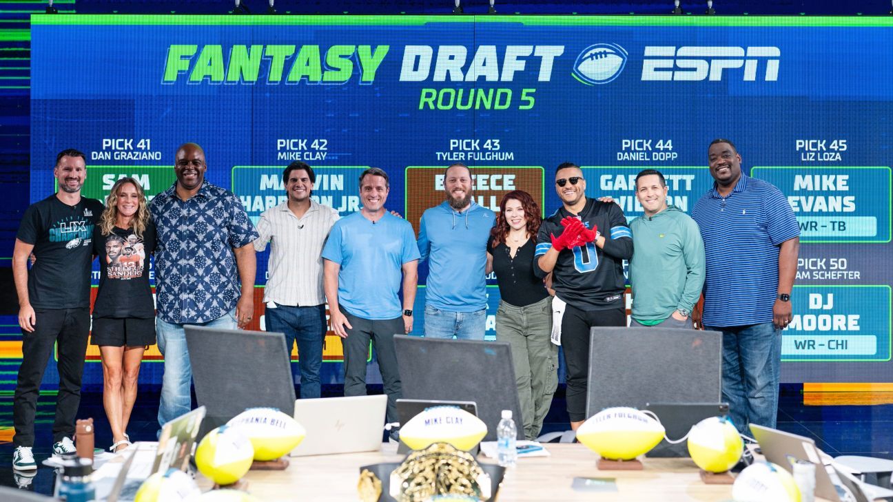 This year’s 10-team PPR draft featured the following participants (in order of first-round selection): Dan Graziano, Mike Clay, Tyler Fulghum, Daniel Dopp, Liz Loza, Stephania Bell, Damien Woody, Eric Moody, Anita Marks and Adam Schefter.