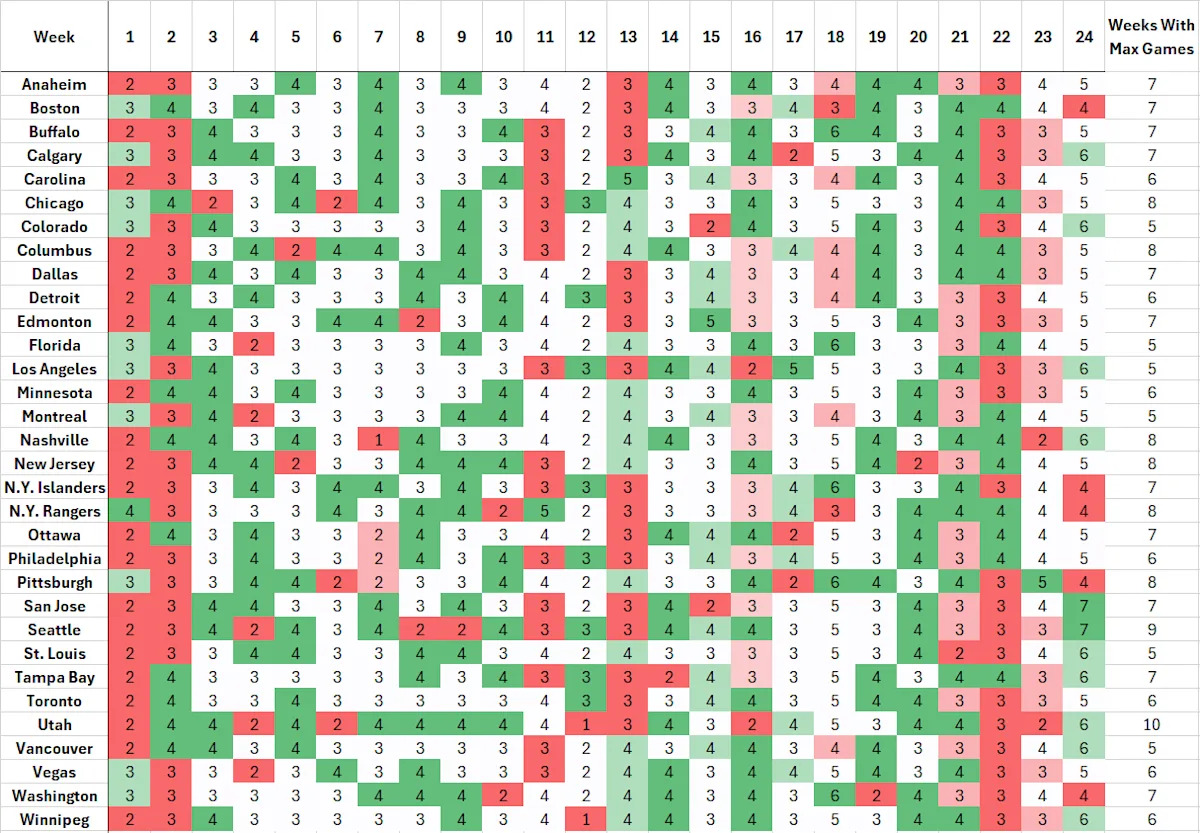If we’re maximizing the team with the most games per week, that would be the Mammoth, who will have 10 weeks where they play the most games. That’s followed by the Kraken with nine weeks, but one of them is Week 24, meaning there are only eight weeks in which they play the most games, tying them with the Blackhawks, Blue Jackets, Predators, Devils, Rangers and Penguins.