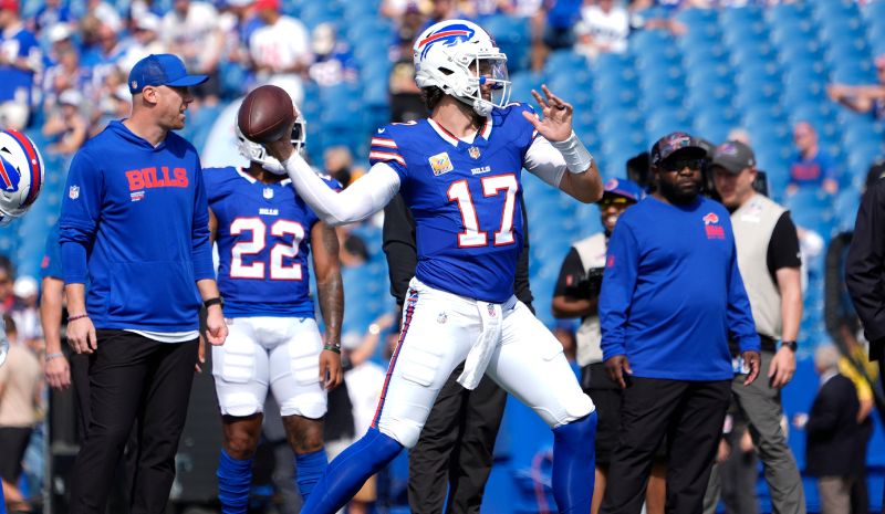 Photo By – Imagn Images. Buffalo Bills quarterback Josh Allen (17) warms up before a game.