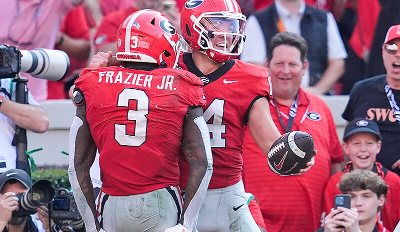 Photo By – Imagn Images. Georgia Bulldogs quarterback Gunner Stockton (14) celebrates his touchdown with running back Nate Frazier (3)