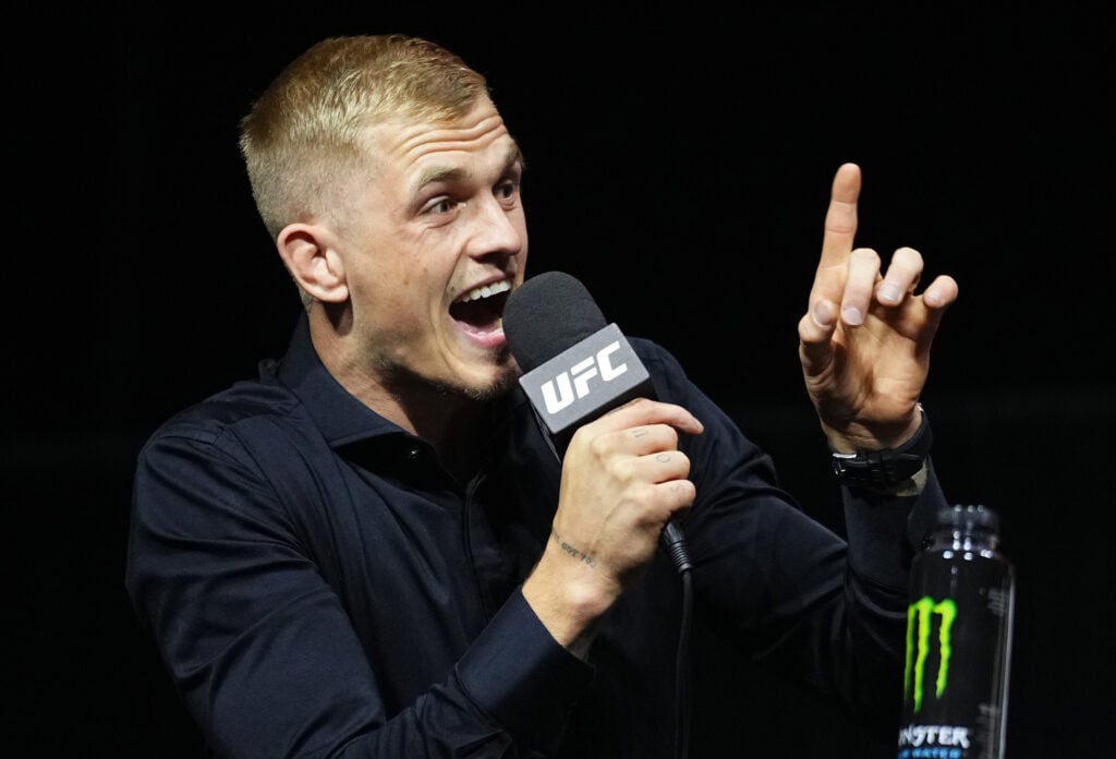 Ian Machado Garry speaks in an animated fashion into a UFC microphone with a bottle of Monster water next to him